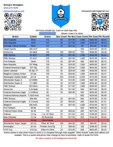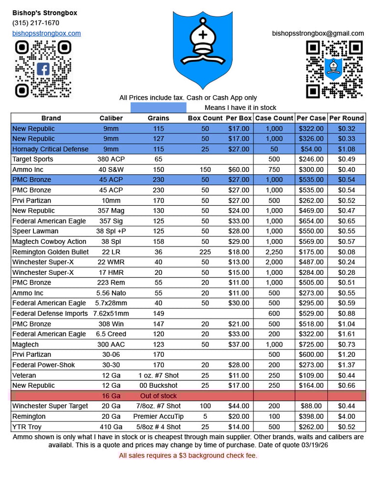 Due to the ever changing market, prices can change daily, I can't guarantee the ammo prices listed are accurate. I do my best to update it frequently. So please fill out the form below and I will get you a quote with current pricing. You can also call/text (315) 217-1670 or email bishopsstrongbox@gmail.com